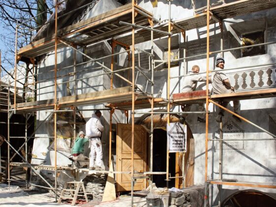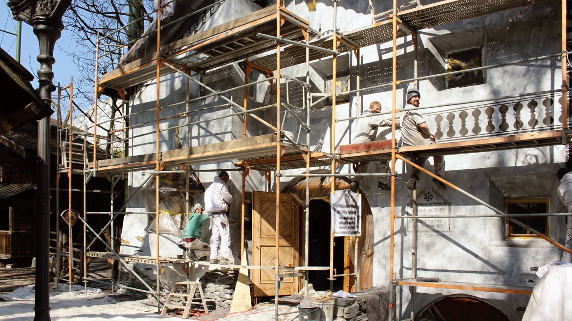 Die Außenfassade mit seinen tiefen Fensterfluchten, Erkern und dem charakteristischen Sgraffito stellte die Firma vor eine interessante Herausforderung.